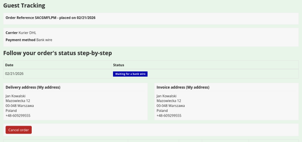 Canceling an order is not the same as returning an order - they are two completely different processes. A customer who has no information about their order is not a customer. Can you log into your bank account without any login information? You can't make this feature so that hackers from all over the world can cancel all orders in our store. This is my own module running on the displayOrderDetail hook - it is visible in standard customer and guest orders. The screenshot shows a simple configuration of the module. Of course, for orders that have the status “Order shipped” or “Delivered,” there can be no question of canceling the order. For such orders, the customer should make a standard return after receiving the shipment. -