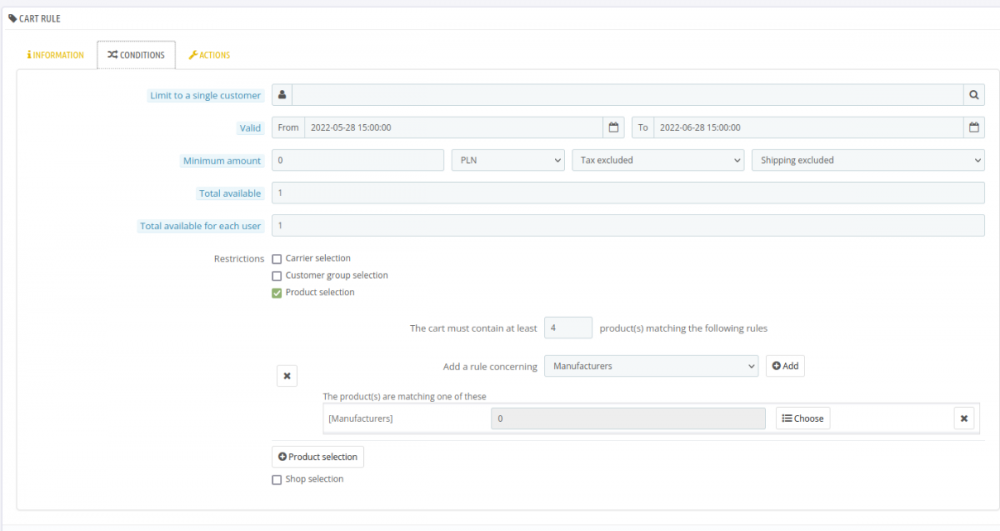 Hello, Think its quite easy one. Then apply if 4 in cart and select by manufacturer (you probably have 1 manufacturer if you sell your products, but you can select ALL). Apply (for example) 10% discount.