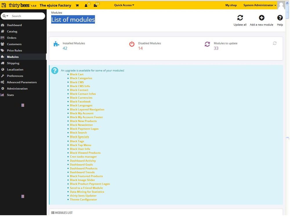 I had Prestashop and the thing was very buggy. A friend migrated the system to Thirty bees 1.0.8 the site has ran great ever since the migration. I hate to mess with anything as it's been running so perfect for over 2mths now. Last time I updated Prestashop tons of things stop working. Nevertheless, I clicked on modules it says I have modules that need updated (see attached image)