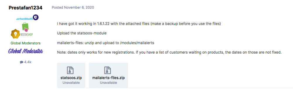Looks like module might need to be updated to work with TB? I unzipped the mail alerts files as instructed uploaded them to the mailalerts module TB showed the mailalert module needed an update so is one overriding the other? Tested only new registrations will show correct date by requesting an OOS email and my test also showed 30-1-0001 date like all the old in stock requests This is the link for anyone else who wants to install this module you must be signed in to prestashop forum for the download to work: https://www.prestashop.com/forums/topic/47173-module-list-of-customer-out-of-stock-registrations/?do=findComment&comment=3277907 Also: product links go to a 404 page link goes to: product.php?id_product=85 when the actual product is: product-name Dates don't show correctly