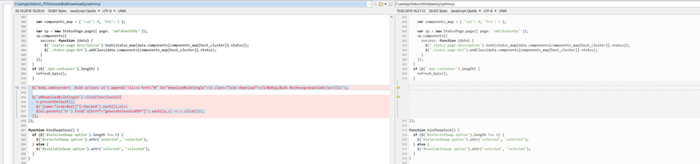 I have a small change to my /js/admin.js that adds the function to mass download invoices. This is incredible helpful to me since I a have a tool running in the background of my OS that monitors my download folder for 'invoice.php'/'invoice.pdf' and send it directly to my printer and moves them then to another folder where my archive tool grabs them... If you change the file with the given lines of code you will get an additionl button in back office order at the bottom where the 'Action' button sits. $('body.adminorders .bulk-actions ul').append('<li><a href="#" id="downloadBulkSingle"><i class="icon-download"></i> Bulk InVOICE download</a></li>'); $('a#downloadBulkSingle').click(function(e){ e.preventDefault(); $('[name="orderBox[]"]:checked').each((i,e)=> $(e).parents('tr').find('a[href*="generateInvoicePDF"]').each((a,c) => c.click())); }); I inserted it into line 911.