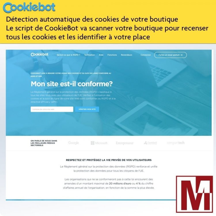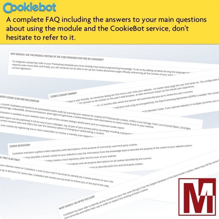 21. Bonjour, Voici un nouveau module d'intégration du service proposé par Cookiebot pour respecter au mieux le RGPD pour vos cookies. La complexité des règles et des exigences du RGPD vous effraie ? Cookiebot vous facilite une partie importante du RGPD : les cookies et le pistage en ligne. L'installation du module rend vos cookies et votre pistage en ligne conformes au RGPD. Conformité Consentement utilisateur personnalisé pour votre site. Conformité complète avec le RGPD. Surveillance des cookies Scan automatique pour suivre et rapporter tous les types de pistage sur votre site. Contrôle des cookies Contrôlez les cookies propriétaires et tiers présents sur votre site avec ce module. Fonctionnalités Cookiebot inclut trois fonctions principales : consentement aux cookies surveillance des cookies contrôle des cookies En profitant des services de Cookiebot et en installant ce module sur votre site, vous allez améliorer la confiance de vos clients dans votre boutique et augmenter naturellement les ventes de celle-ci. Images Téléchargement : Thirtybees: https://store.thirtybees.com/shop-modules/cookiebot-monitoring-and-control-of-cookies Prestatoolbox : https://www.prestatoolbox.fr/publicite-marketing/426-rgpd-cookiebot-surveillance-et-controle-des-cookies.html Addons : https://addons.prestashop.com/fr/legislation/39825-cookiebot-surveillance-et-controle-des-cookies.html