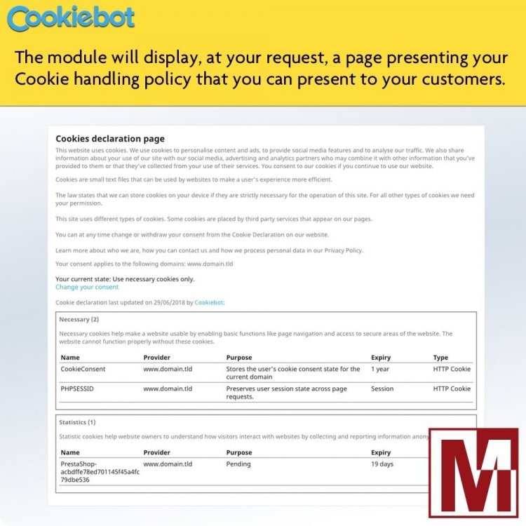 22. Hi, Here is a new service integration module proposed by Cookiebot to best respect the RGPD for your cookies. Tired of complex GDPR rules and requirements? Cookiebot have made one part of the GDPR simple - cookies and online tracking. Cookiebot makes your cookies and online tracking GDPR compliant with just a module. Cookie consent Customized user consent for your website. Full compliance with GDPR. Cookie monitoring Automated scan to monitor and report all types of tracking on your website. Cookie control Control both first and third party cookies on your website with this module. Features Cookiebot consists of three main features: cookie consent cookie monitoring cookie control. By taking advantage of Cookiebot's services and installing this module on your site, you will improve your customers' confidence in your shop and naturally increase its sales. Images Download: Thirtybees: https://store.thirtybees.com/shop-modules/cookiebot-monitoring-and-control-of-cookies Prestatoolbox: https://www.prestatoolbox.com/advertising-marketing/426-gdpr-cookiebot-monitoring-and-control-of-cookies.html Addons: https://addons.prestashop.com/en/legal/39825-cookiebot-monitoring-and-control-of-cookies.html