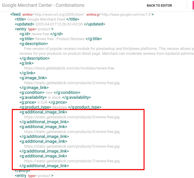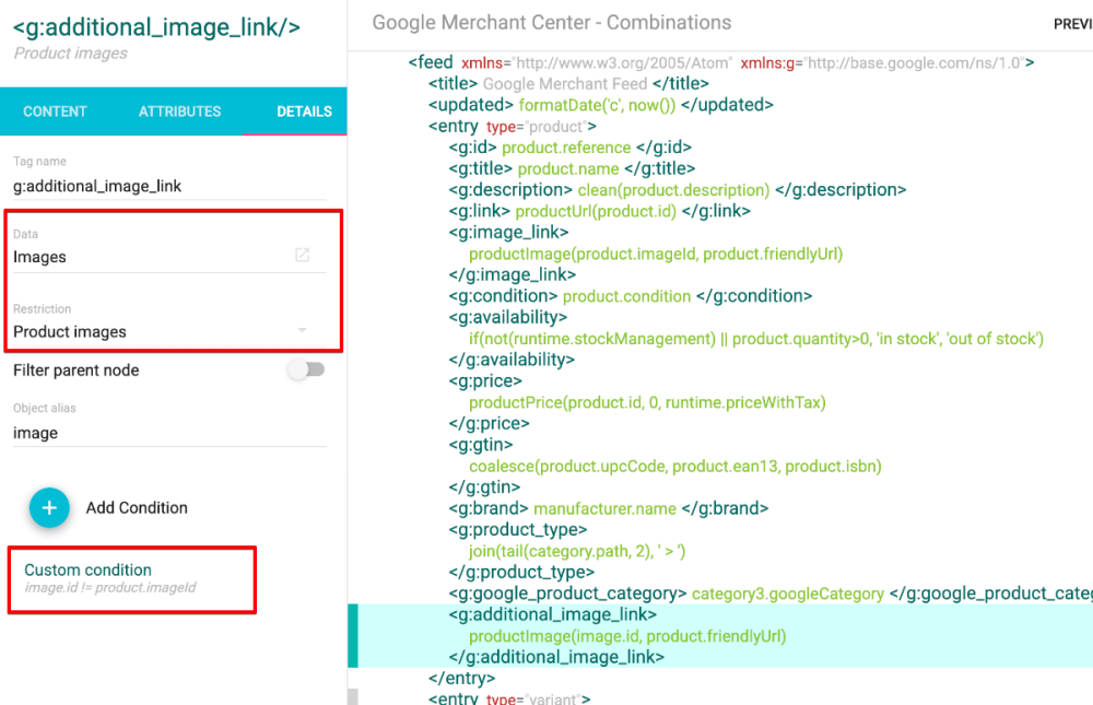 Well, this is more complicated. To accomplish this, you will first need to slightly amend the code of the module. Edit file /modules/datakick/engine/prestashop/schema/combination.php find section 'fields' -- it begin with this code like this (depending on module version it might be slightly different): 'fields' => [ 'id' => [ 'type' => 'number', 'description' => 'id', 'selectRecord' => 'combinations', 'mapping' => [ 'pa' => 'id_product_attribute', 'pas' => 'id_product_attribute', 'sa' => 'id_product_attribute' ], 'update' => false ], and inside this section add new field: 'hasImages' => [ 'type' => 'boolean', 'description' => 'Has associated images', 'update' => false, 'sql' => 'EXISTS(SELECT 1 FROM ' . _DB_PREFIX_ . 'product_attribute_image AS pai WHERE pai.id_product_attribute = pa.id_product_attribute)', 'require' => ['pa'] ], After you save it, you will be able to use this new field in datakick module. You can use it in condition. Edit conditions for <entry> node: This way, you can have a section that display only combinations that have explicitly associated images. In this section, we want to display only images associated with combination. So edit <g:additional_image_link> node, and use 'Restriction = Combination images' Next step is to duplicate entire <entry type="variant"> node, but this time use condition Combinations: Has associated images is No This new section will display only combinations without explicitly associated images. In this section, we want to show all product images. So you should edit <g:additional_image_link> node and use Restriction = All data (all images) add custom Condition (combination.productId == image.productId) to filter out images that belongs to other products At the end, you will have three <entry> nodes at the top level nodes of your template, it should look like this (I've removed the children nodes of <entry> nodes):
