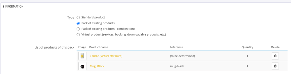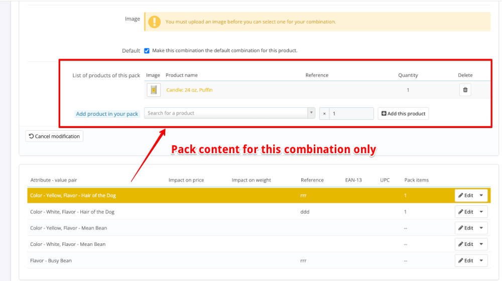 Thanks everyone for testing. I've created the issues for those problems, and will make sure they are addressed before we merge this into bleeding edge. As we found out, the solution we implemented before was not good enough for all use cases. The virtual/dynamic attributes are fine in most cases, but sometimes we need even more flexibility. So we implemented yet another enhancement in this area -- full-fledged packs per combination. You can now choose between two different versions of packs Pack of existing products -- original implementation, when pack is defined on product lavel. You can use virtual/dynamic attributes here to tweak pack content using dynamic product attributes, as described in this thread above Pack of existing products - combinations -- new functionality. When you select this, you won't be able to define pack on product level, but you will have to define packs for every combination separately. This gives you great flexibility, as your combinations can have totally different/independent pack items. But obviously, it will be more complicated to set up, as you need to define pack content for every and each combinations. So choose this only when appropriate Pack content on combination level: This new functionality is in pack-combinations branch. If you can, please help us with testing once again.