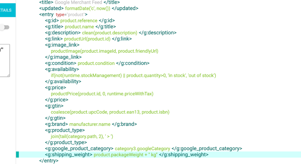 The standard template that datakick module installs do not contain shipping weight by default. You can very easily add it, though. GMC documentation https://support.google.com/merchants/answer/6324503?hl=en tells us that they are looking for element like this <g:shipping_weight>3 kg</g:shipping_weight> So let's edit the template, and add this element under <entry> node To get data in correct format, you need to use the expression product.packageWeight + " kg" Note that you need to do this twice if you are using GMC template for combinations, as there are two <entry> nodes in template, one for products without combinations, one for products with combination. In this case, you will need to use different expression in second node: combination.packageWeight + " kg" You can download this template: gmc-with-weight.json and install it into your datakick module, as an inspiration
