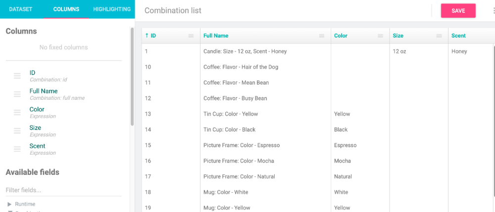 Congrats, you have discovered a bug 🙂 This will be fixed in next release. Meanwhile, you can edit file modules/datakick/engine/prestashop/functions/combination-attribute-value.php and change lines 97 and 88 from AND comb.id_product_attribute = ' . (int)$combinationId . ' AND a.id_attribute_group = ' . (int)$attribute . ' to AND comb.id_product_attribute = ' . $combinationId . ' AND a.id_attribute_group = ' . $attribute . ' With the fix in place, you can extract any attribute value, if you know attribute group id. For example, if I have these attributes groups: I can create list of combination, and use combination id + constant 3 to extract color from combination: combinationAttributeValue(combinations.id, 3)