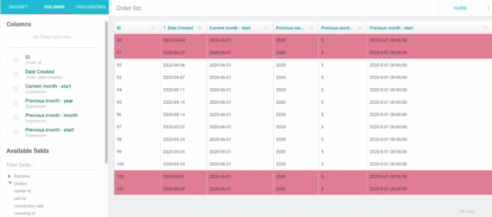 Hi @haylau, thanks for the question. I'm really glad you like my module. Your use case can be done with a bit of 'datetime arithmetic'. Let me guide you through. I just implemented this on my demo server, you can have a look at list named Previous month orders only: When I run this list today (2020-06-02), I want to remove orders that: were created before the start of previous month (2020-05-01) or were created after the start of current month (2020-06-01) So I will need to add two new conditions. Let's start with the second one, because it's easier Filter out order created after the start of current month In my expressions, I will use field runtime.timestamp that contains current time. I need only a year and month parts of this date, though. To extract it, I can use function formatDate. I will use format 'Y-m' which will return year and month: formatDate('Y-m', runtime.timestamp) this will return string 2020-06 This is almost what I want. All I need to do is append static string to it: formatDate('Y-m', runtime.timestamp) + '-01 00:00:00' this will return string 2020-06-01 00:00:00 Which is the start of current month. Now, I can use this expression to include only orders created before this date. The condition will look like this: orders.created < toDate('Y-m-d H:i:s', formatDate('Y-m', runtime.timestamp) + '-01 00:00:00') I had to convert string back to datetime using toDate function, and then I can finally compare it with order creation date Filter out orders created before the start of previous month Second condition will be more complicated, because we need to figure out previous month To do this, I will once again use formatDate function, but this time I will use format 'm' to extract month part only. As of today, this format would return string '06'. I will convert string to number 6, and then substract 1: toNumber(formatDate('m', runtime.timestamp)) - 1 When I run this expression on 2020-06-02, it will return number 5, corresponding to previous month. However, if I run it on 2020-01-20, the result would be 0. That's not what I want, I need 12. To fix this, I can use simple if expression: if(formatDate('m', runtime.timestamp) == '01', 12, toNumber(formatDate('m', runtime.timestamp)) - 1) The if function takes three parameters. The first parameter must evaluate to true/false. If it evaluates to true, then the result of if function is the second parameter. If it evaluates to false, the result is third parameter. In our case -- if month part is '01' (January), the previous month is 12, otherwise the previous month is (current month - 1) Now we know the month part. We also need to figure what year is previous month in. To do so, I will use formatDate function with 'Y' format: if(formatDate('m', runtime.timestamp) = '01', toNumber(formatDate('Y', runtime.timestamp))-1, toNumber(formatDate('Y', runtime.timestamp))) This expression reads as: if current month is January, then return current year - 1, otherwise return current year. Now that we know year and month part, we can construct start of previous month. I can simply concatenate these expressions together: if(formatDate('m', runtime.timestamp) = '01', toNumber(formatDate('Y', runtime.timestamp))-1, toNumber(formatDate('Y', runtime.timestamp))) + '-' + if(formatDate('m', runtime.timestamp) == '01', 12, toNumber(formatDate('m', runtime.timestamp)) - 1) + '-01 00:00:00' The result of this expression is 2020-5-01 00:00:00 Now I can use this expression to finally create a condition to include only orders created after this date: orders.created >= toDate('Y-m-d H:i:s', if(formatDate('m', runtime.timestamp) = '01', toNumber(formatDate('Y', runtime.timestamp))-1, toNumber(formatDate('Y', runtime.timestamp))) + '-' + if(formatDate('m', runtime.timestamp) == '01', 12, toNumber(formatDate('m', runtime.timestamp)) - 1) + '-01 00:00:00') It's a little bit complicated, but fortunately it can be done.