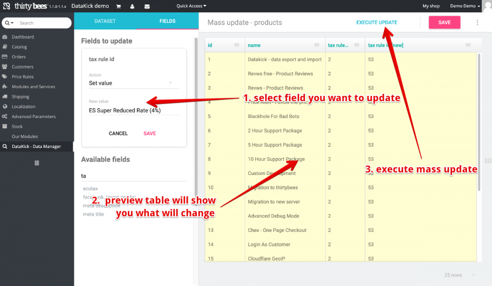 Hi, unfortunately mass update does not support changing associations between records, so it's not possible to assign category to product this way. Mass updates can only update record fields. It's true that product record has 'categories' field, but this is virtual/read only field for export purpose only. The only way to modify associations using datakick is via import functionality.