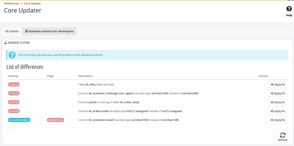 New version of coreupdater module was released yesterday, and it contains one new functionality I'd like to talk about a little bit: Database schema comparator and migration What does it mean? It means that core updater will now look into php codebase and extract metadata from object model classes (like Product, Customer, or Order). These metadata describes exactly how database should look like -- what database tables should exists, what columns should they contain. It describes primary or foreign keys, column type, default values, collations, etc.. Core updater will use these collected information and compare them against your actual database schema. And if there are some differences, it will report them. And it will also allow you to fix them. This essentially makes php codebase single source of truth in regard to database structure. When you install your system from scratch you shouldn't see any database differences. But those of you that are running your thirtybees system for a long time now will see a lot of differences. It could happen for many reasons we developers tend to forget about implementing respective sql migration when we change php code when we actually implement such migration script, it can contain errors. After all, php devs aren't usually mysql experts also, some modules can change database schema for their needs Why do these differences matter so much? That's because PHP code operates under some assumptions. For example, it expects that order reference code can contain 11 characters. The php code that generates unique reference code for order can fail terribly if the actual database column can store only 10 characters. The error can occur right there during reference code generation (then it's easy to find). But it can happen much later. With these data consistency issues it's hard to figure out how they happend, and how to fix them. By aligning your database structure with expected database schema, you are much closer to (my favourite) vanilla thirtybees installation. Thirtybees core code will run more smoothly in such environment. I'm not saying it will not run OK on modified database schema, just that there can be some very strange behaviour sometimes. How to use this new tool Please be aware this is experimental feature, and requires some database knowledge. It's not very user friendly. And some messages will probably scare you -- but that's intended behaviour. It is very powerfull tool, but we should use it very carefully. There is new tab named Database schema (for developers). This tab will display you all (relevant) database differences. Note that thirtybees core needs to support this functionality. At the moment, this is supported in bleeding edge only. In current version 1.1.0 or older, this tab will simply inform you that the database comparison functionality is not supported. So, if you want to test this new functionality, please migrated to bleeding edge. This is how the list of database differences looks like. You should review all differences, starting with those marked as critical While it says critical, the reality is usually not so grim. Obvisouly, missing columns or tables are indeed very serious issues, and you should fix these immediately. But different column type is not such a big deal. All database differences can be fixed. You can simply click on Apply fix button to adjust database. Please make sure you understand what this means!!! Some database differences can be actually valid and wanted. For example, some module might have changed database structure of core table in order to provide some additional functionality. *Fixing* this table back to original state might break the module. One such module is *Multiple feature values* -- this module drops unique key for one core database table in order to actually save multiple feature values into the database. If unsure, please ask here -- it also gives us opportunity to learn more about different type of customizations. And some video: