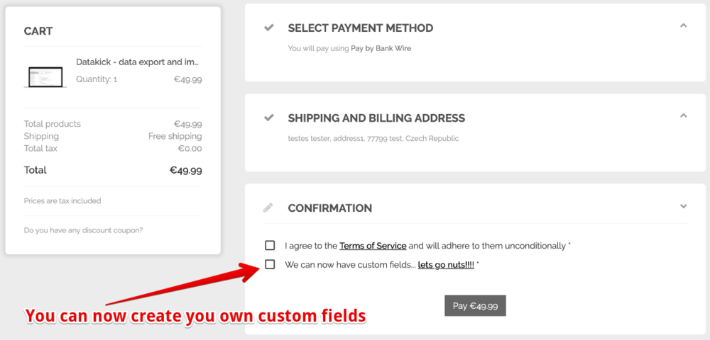 7. New version 0.5.0 - FIELDS MANAGEMENT I've just released new version of chex module. This new version allows you to manage entry fields: you can now hide fields you don't need in checkout form (for example company name or vat number) you can create your very own custom fields. For example custom GDPR checkbox There is a plan to further extend this area. In future version(s) I plan to add ability to define custom layouts (move fields around) edit build-in fields (rename label, placeholder, required state, etc) actually save custom field values. Although you can now create your own custom fields, entered values are NOT stored anywhere. So, apart from required checkbox that can be used to prevent form from being submitted, it's pretty useless at the moment. Also, this new version of implements better persistence for entry fields -- for example, selected country/state is now remembered and survive page reload. You can test on my demo account, or download from my store