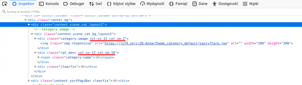 Image has class col-xs-12 col-sm-2, and category name has class col-xs-12 col-sm-10. That is, on phones image will take up 100% of the width, and on screens small and larger 1/6 or 16.7% of the screen width. In bootstrap, number 12 is the whole thing or 100%. If you make image and category name with classes col-xs-12 col-sm-6, they will occupy equally 50% each on screens small and larger. We modify category.tpl template. https://www.w3schools.com/bootstrap/bootstrap_grid_system.asp