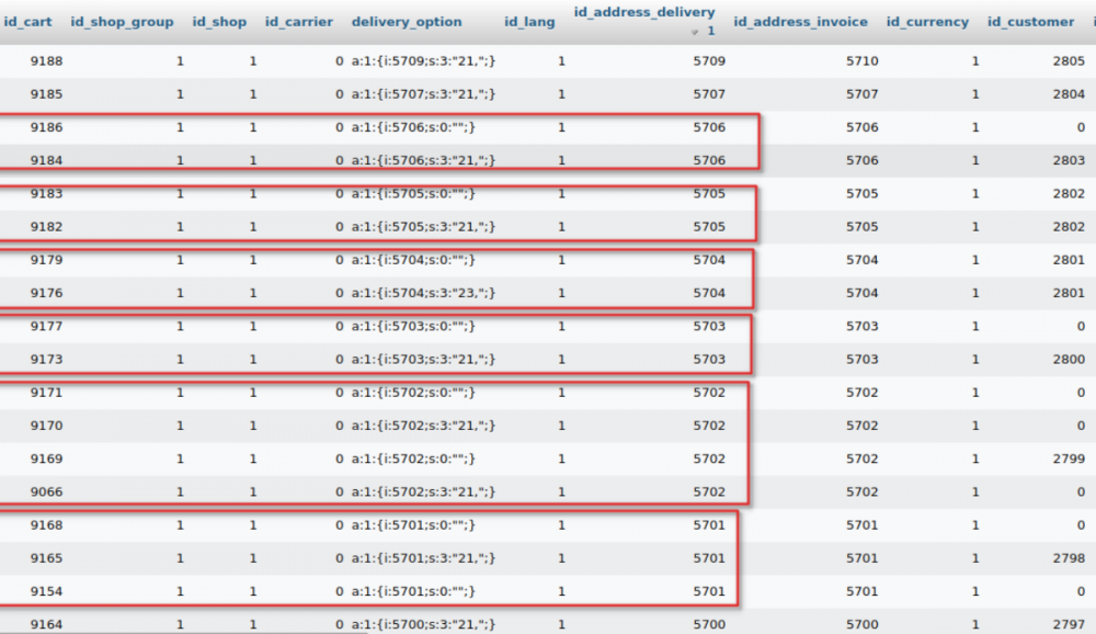 @datakick we do have a strange problem occuring with orders. Different customers create new shopping carts and the addresses of previous customers are assigned to them. We do use Chex I don't know, and I don't know if Chex by any chance has an impact on this error with the mechanism of remembering baskets. I have also noticed that there are rare situations when a customer registers on the site, leaves the site and after a few days comes back to finalize the order. The order confirmation shows not the data he addresses into Chex when placing the order, but the delivery data from the previous customer (in the Prestashop panel it looks as if the customer has 2 addresses set up, the default one being the wrong one, from the previous customer). There's a screenshot from the ps_ cart table: I would be very grateful if you could help by any means - we do use Chex on 2 of our websites, and we would love to continue doing so.