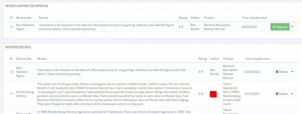 So I have basically two issues with the module stated above. The first issue is that the review popup is missing the id_product value in the url for the product image: https://mydevelopmentsite/-medium_default/warlord-necropolis-skeletal-warrior-grunt.jpg I really haven't started to debug this yet because depending on the cause it should be fairly easy - just annoying that something this egregiously defective has made it into a released copy of code from the TB Team. The second issue is that the "Reported" reviews list is essentially an exact duplicate of all of the reviews in the tables while the tb_product_comment_report table is actually empty. [Screenshots attached] I have other more pressing issues to fix for my migration first, but thought I would post this here now and see if anyone has found solutions to these issues already. Thanks!