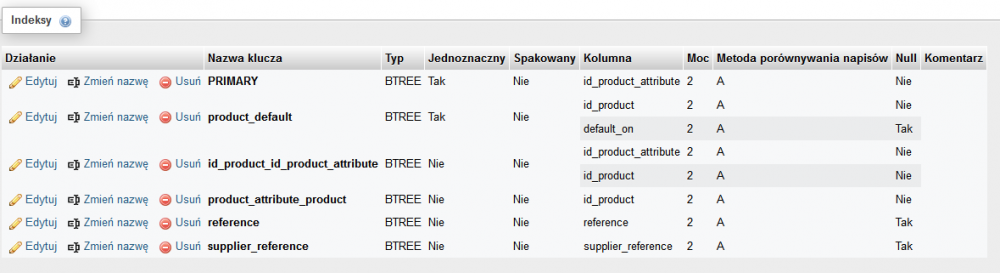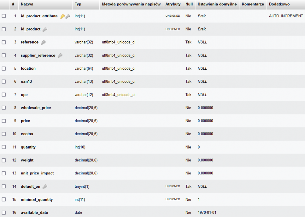 8. Hello, as my shop is far slower than a toaster I've decided to install it from scratch. I'm importing tables at the moment and I've got problems with tb_product_attribute. I am getting the following error: INSERT INTO `tb_product_attribute` VALUES ('76', '451', '67250', '', '0', '5905001672506', '', '0.000000', '114.950000', '0.000000', '0', '0.000000', '0.000000', '0', '1', '0000-00-00'); There are 5 attributes for this id_product and only one of them is set to 1 in the default_on field. MySQL imports only two of them. 😞 Is everything all right with the table configuration?