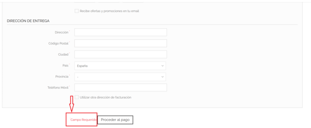 Estoy intentando ocultar el texto que aparece en color rojo y que indica "Campo Requerido" (sobre todo me interesa el que está al lado del botón de proceder al pago).