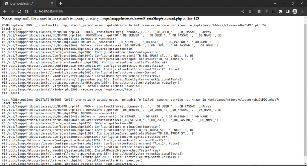 Tried different, Now I'm running xampp. But the same result in apache Etc. I tested Prestashop 17 and 8.3 without problems on this distro. Can you tell me which folder and php file the db settings are stored.