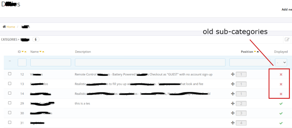 3. Hi, it's my first time posting on the forum. Since I'm not a techie, can I request ya'll explain the technical solution to a non-technical person. Greatly appreciated. (not wanting to offend anyone on this forum, certain items are blacked out on image) Below is the process that got me into this sticky situation. 1. General Preferences activated and enabled > "Enable Multi-Store" 2. Advanced Parameter > Multi Store: made changes to the store name, repeated steps 1 & 2 and did reset to default positions (multi store is now disabled) 3. Attempted to delete the 3 sub-categories boxed in red on image - THEY ARE NOW LOCKED IN THE X POSITION. They will not delete with the >"EDIT" "DELETE" function, also they do not show up as a sub-category in my file structure or menu. My current work-around is to create three identical sub-categories, and they seem to be working just fine. However, I do know that having dead links floating not good for performance, search engines, etc. 4. When I attempt to delete the locked categories, it automatically bounces back to the main category Question: How do i go to delete the X (old, unused, stuck) categories? Any advise or thoughts are appreciated. NOTE: the 3 old sub-categories now have the same position "1"