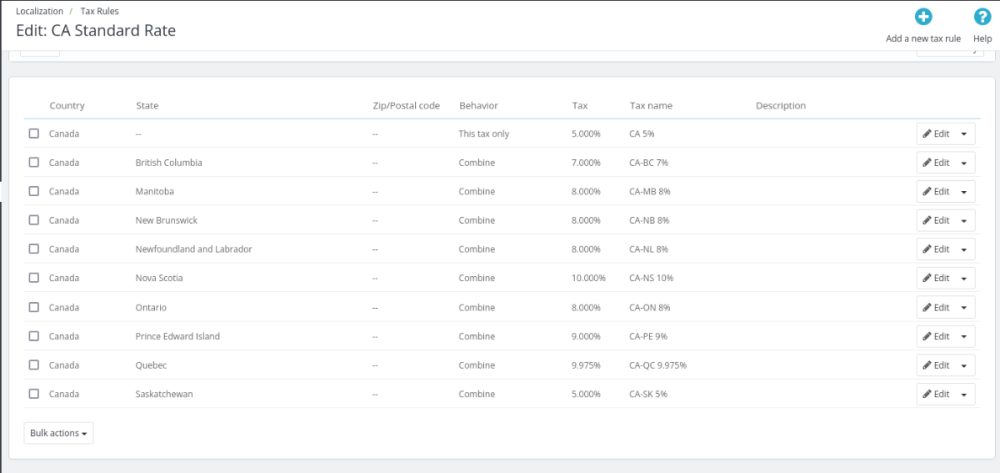 Check your tax configuration in Localization -> Tax Rules Maybe you have deleted tax for some provinces. Screenshot below shows the default tax configuration for Canada imported by thirtybees.