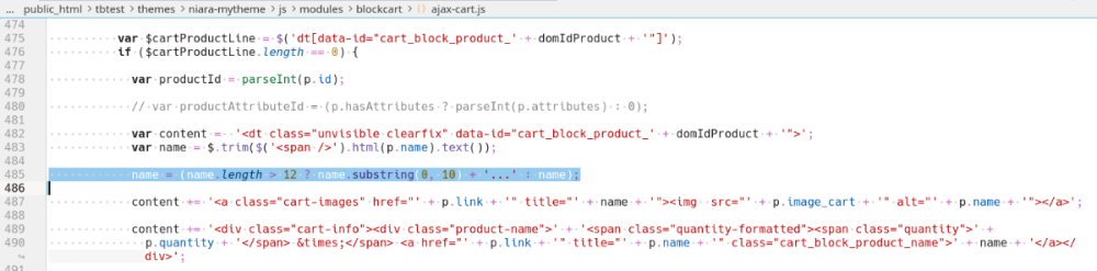 The override mechanism does not work for front-office themes. You can do it this way: 1. in the /themes/ directory, copy the /niara/ directory to, for example, /niara-mytheme/ 2. in the Preferences -> Themes: "Advanced settings" configuration, change the directory for the Niara theme to "niara-mytheme" After such a change, the Core Upader will not overwrite the files from your "niara-mytheme" directory. And the truncation of the product name in the cart is also performed in ajax-cart.js