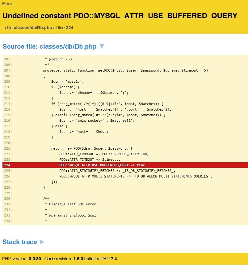 Hi everyone, I want to upgrade from version 1.5 to 1.6 (that's already done and went quite smoothly), and of course I also want to upgrade to PHP 8.0 and higher (I'm currently on PHP 7.4). I have activated nd_pdo_mysql in cPanel. However, I'm encountering the following error, and I'm stuck... Does this have anything to do with: https://github.com/thirtybees/thirtybees/issues/1600