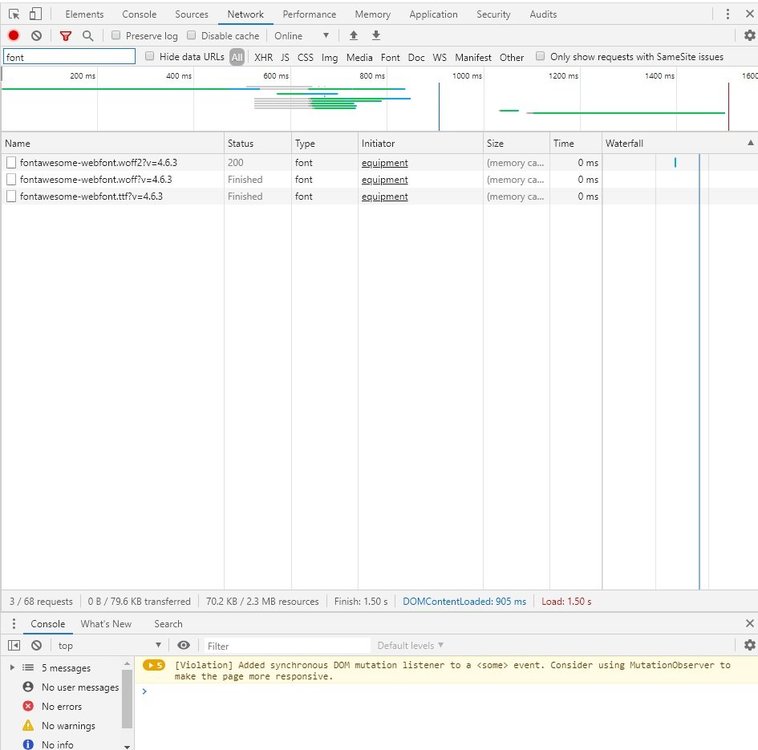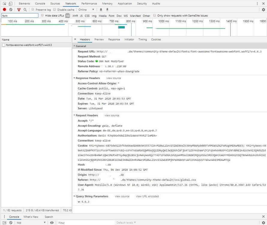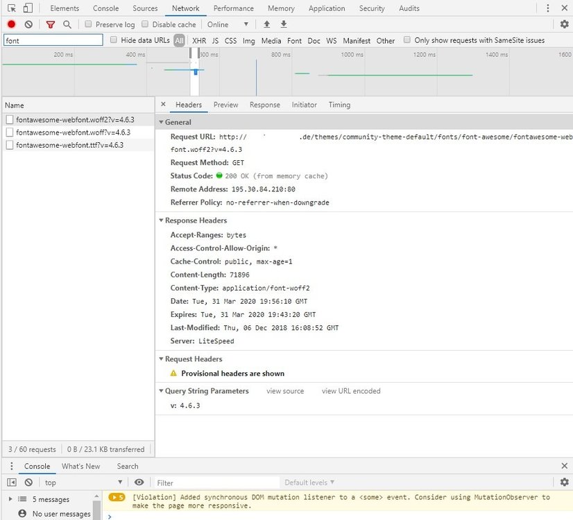 Hello, i have a strange thing with FontAwesome - this is not loading since we have moved to an other faster hosting plan. It only shows weired signs in the Frontoffice, e.g. at button cart, contact and so on. Pls. refer to the picture. The 'old' hosting plan was with Apache and MySQL, the new is with nginx and MariaDB on SSD drives. Not sure if this can be a reason? The move was directly with copying all files and import DB via phpMyAdmin. We are not using the standard theme, but when i change the frontend theme to default, the FontAwesome will NOT be loaded either. I have checked path and files again and again and the files are stored correctly, i also have tried various permissions, without any effect. In global.css there is the following call: src: url ("../ fonts / font-awesome / fontawesome-webfont.eot? v = 4.6.3"); src: url ("../ fonts / font-awesome / fontawesome-webfont.eot? # iefix & v = 4.6.3") format ("embedded-opentype"), url ("../ fonts / font-awesome / fontawesome -webfont.woff2? v = 4.6.3 ") format (" woff2 "), url (" ../ fonts / font-awesome / fontawesome-webfont.woff? v = 4.6.3 ") format (" woff ") , url ("../ fonts / font-awesome / fontawesome-webfont.ttf? v = 4.6.3") format ("truetype"), url ("../ fonts / font-awesome / fontawesome-webfont.svg ? v = 4.6.3 # fontawesomeregular ") format (" svg "); and the direct path on server is: /public_html/shop/themes/community-theme-default/fonts/font-awesome So this file is also offered for download when called up in the browser and is therefore found (the other file extensions too): mydomain.xyz/themes/community-theme-default/fonts/font-awesome/fontawesome-webfont.eot mydomain.xyz/themes/community-theme-default/fonts/font-awesome/fontawesome-webfont.woff2 etc. We have deleted or emptied the .htaccess too, but with no success or other result. Do you have any idea or solution?! thank you -