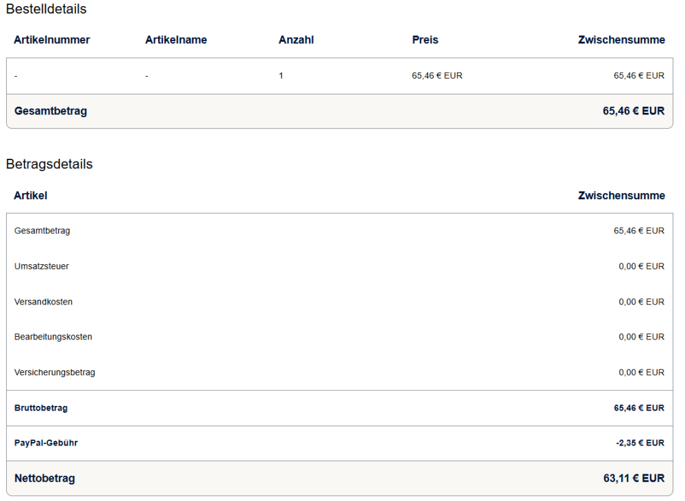 Hi guys, years have passed and I need to activate the topic. We also don't get any details of the order in the Paypal overview. The order number isn't even passed on (but I think I know the problem, since there isn't an order number when Paypal is called up, right?). Look at the picture. But it would be really great if we had a Paypal module or a solution that could do that now... Our old shop system (more than 12 years old) was able to pass the items, shipping costs and also the order number to Paypal without any problems. Is there a solution or a hack for this now?
