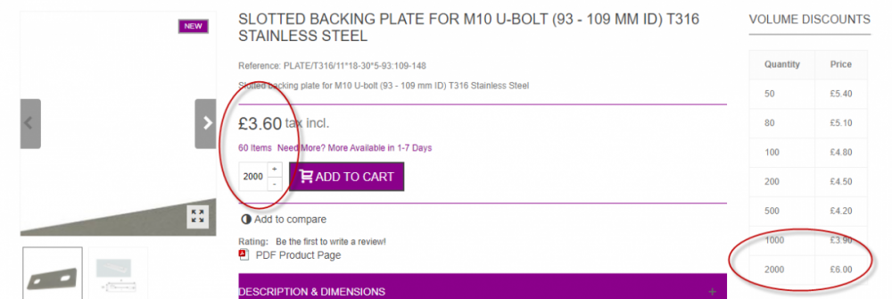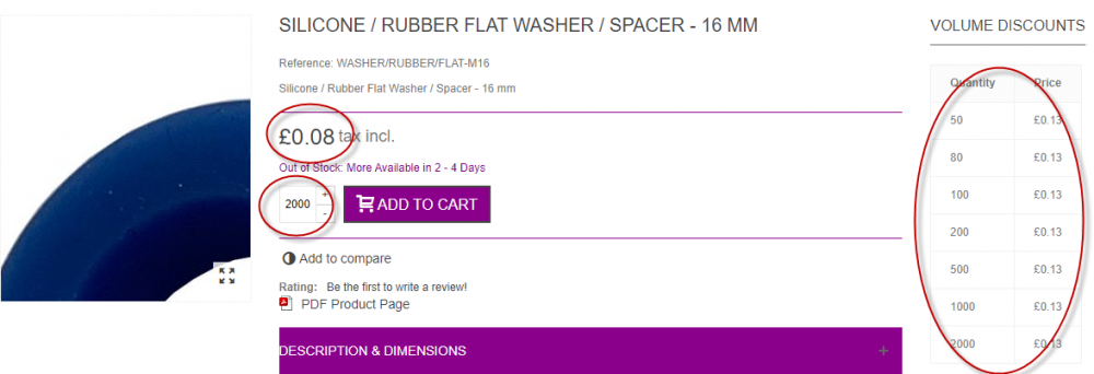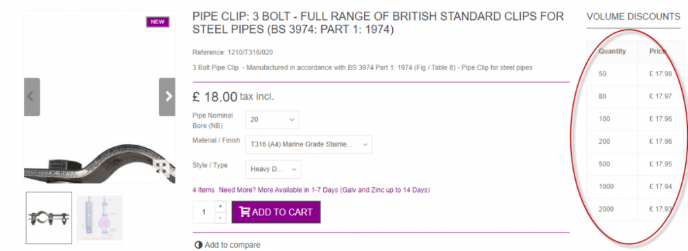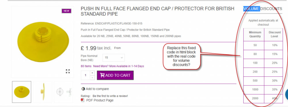 So, I managed to move the block of code in products.tpl - and it looks great Now, there is a calculation issue. This is not to do with moving the code. I have tried leaving the code where it should be. Not to do with the theme because I have tried the code directly from niara. It ust be an inherant bug I have changed the table to show prices rather than discount level Display discounted price set to yes in preferences > Products So, the calculations are all over the place. som times totally wrong, sometimes partially wrong. It is not to do with browsers or caches Some examples This one shows price is calculated correctly on the main buy box, but the volumes discounts not calcualted at all This one shows most of the volume discounts are correct, just not the last one And this one shows some calculations but they are all wrong And just for reference all products have got these discounts associated with them I will have to leave it showing % for now, but this is weird. At first I thought it may just be to do with rounding on small values because I was looking at low value products, but that last one shows that is not the case. Any clues?