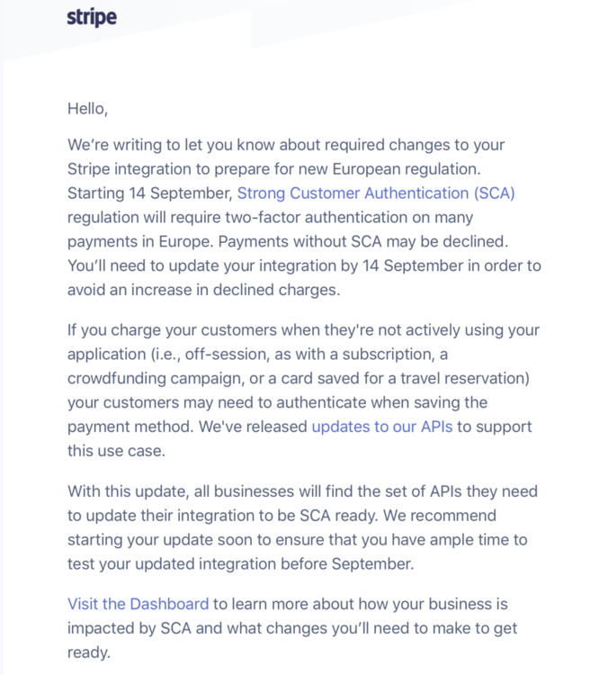 Hi, guys! A few weeks ago I knew about the next changes on all payment ways, the Strong Customer Authenticacion (SCA). I received an email from Stripe and I know we'll need PayPal and other modules updates to this new legal requirements. From next September will be required on all payments mades from a card, so my question is if anyone is working on this thing or if we need to ask someone to do it. Maybe this info (is only Stripe case) helps: https://stripe.com/payments/strong-customer-authentication Thank you, like always!