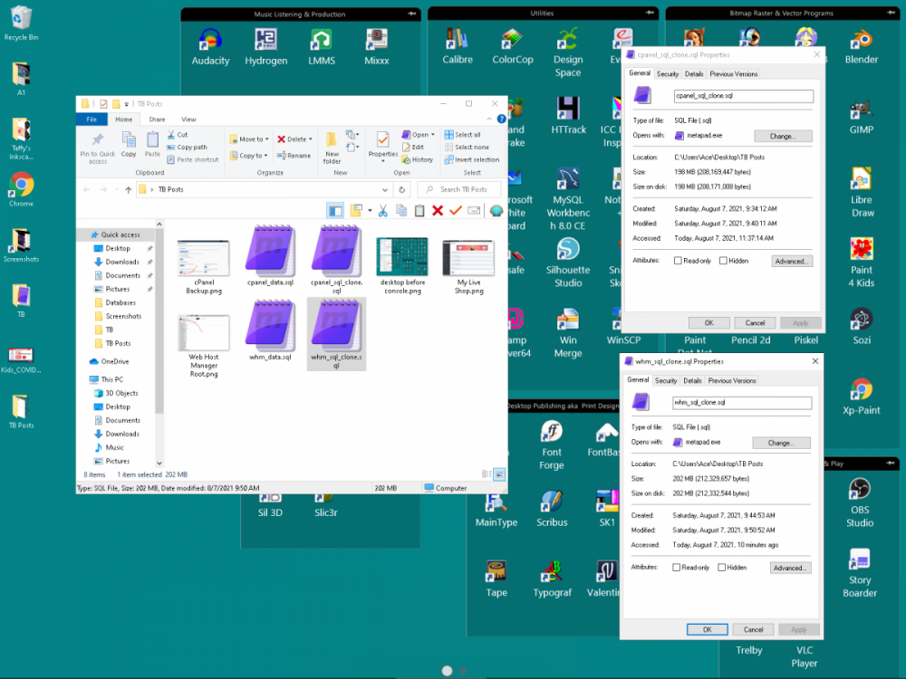 So I'm back too hopefully understand why the .sql backups I download are different sizes. So in this first snap above I have my live site in maintenance mode. I have cleaned all the tables with "Database Optimization" module. In this second snap I download my website .sql file while the website is closed and tables are clean. In this third snap I'm logged in as root in Web Host Manager (WHM) and I download my website .sql file again to compare with the first one from cPanel. In this finial snap I am comparing the size of each .sql file and as you can see they are different. This is what I don't understand. Why are they different sizes? brb with another post to finish up all the info I have gathered this morning. Again I'm just trying to understand why. Ty Billy