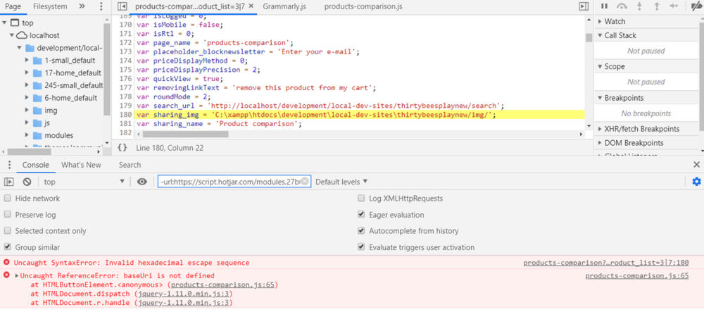 Hi I've been getting a js error on TB 1.1.0 with Product Comparison when trying to remove a product (adding appears to be ok). The loading image appears and "loads forever" and throws the following js error: products-comparison.js:65 Uncaught ReferenceError: baseUri is not defined at HTMLButtonElement.<anonymous> (products-comparison.js:65) at HTMLDocument.dispatch (jquery-1.11.0.min.js:3) at HTMLDocument.r.handle (jquery-1.11.0.min.js:3) Notes: This is on local Xampp dev environment with PHP 7.2. Problem occurred in 1.08 previously as well. Your help is appreciated in advance.