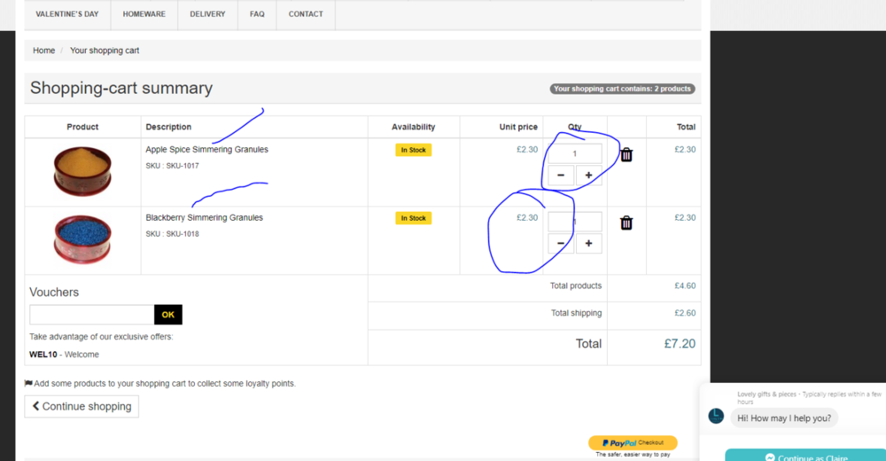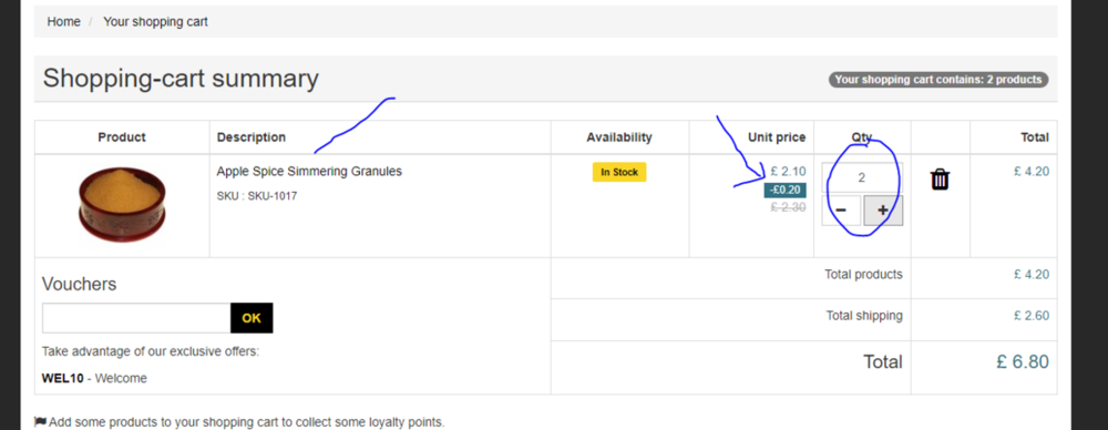 Hi, So, I've got it set up to offer discounts on selected products/categories whereby you purchase 2 or more from that product line, you save per item. This is especially good for the home fragrances, bath bombs and soap slices categories. However, the discount is only applied if they put the same item in their cart - for eg: they add 1 apple spice simmering granule and 1 vanilla musk in the cart, it should in theory discount both items added from that category. But it doesn't. It only works if they put 2 of the same scent into the cart. I've put a message on the category pages to state that they can add to cart and message me afterwards with their chosen scents, but this may put off some people. Don't know if I'm missing something or not - is there a way to get the multi buy discounts to work from products within the same category? Thanks in advance, Claire